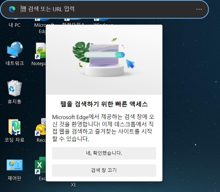 - 해당 앱이 설치되고 윈도우 사용하다 보면 바탕화면에 검색 창이 나타납니다.