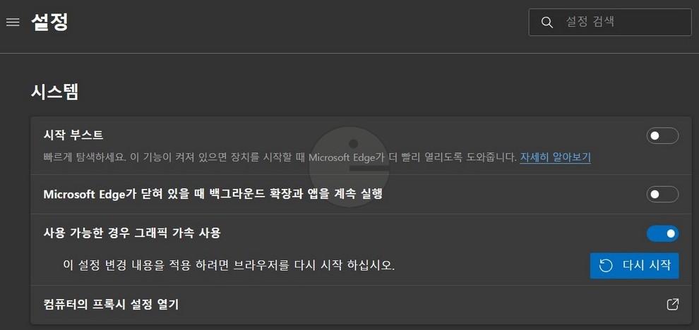 그래픽 가속 기능의 설정을 변경하면 브라우저를 다시 시작해야 변경 내용이 반영됩니다.