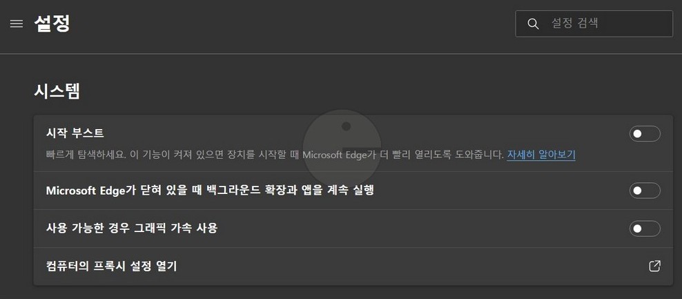 임시 복구: 엣지의 설정 / 시스템 / "사용 가능한 경우 그래픽 가속 사용" 변경
