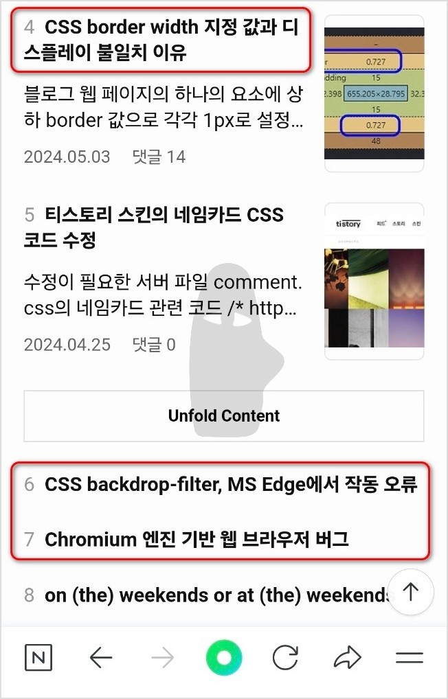 글 리스트의 동일한 제목인데도 상단의 글자가 하단의 글자보다 큽니다. 원래 하단 글자 크기가 지정한 값입니다.