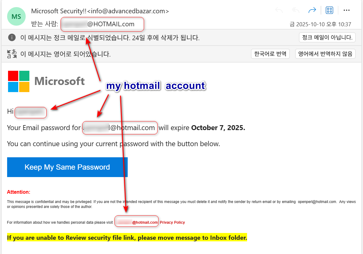 3. 2025년 10월 7일 메일 계정 암호가 폐기될 것이므로 조속히 본인 계정에서 암호의 변경 사용 여부를 확인하도록 재촉하고 있습니다.