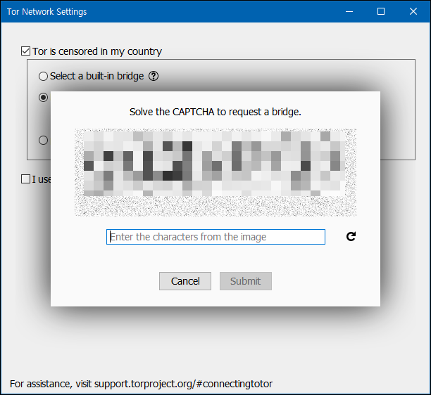 Tor Project에서 제공하는 무료 브리지 서버(일종의 VPN)을 사용할 수 있습니다.