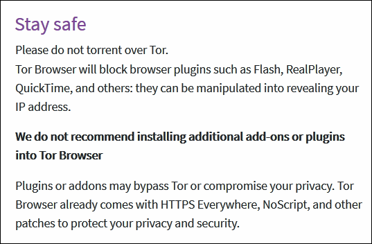 - 마지막으로 Tor Browser는 토런트를 지원하지 않으며, Flash, RealPlayer, QuickTime 등의 브라우저 플러그인을 차단합니다. Tor Project는 부가 서비스를 지원하는 애드온 혹은 플러그인을 Tor Browser에 설치하는 것을 권장하지 않습니다.