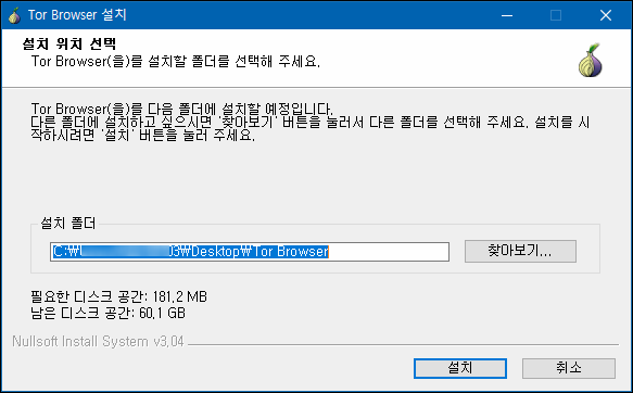 - 설치 위치 선택합니다. 기본 설정은 바탕화면의 "Tor Browser" 폴더입니다.