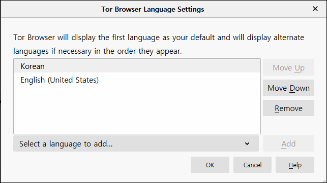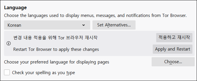 Korean을 추가 설치하고 버튼을 누르면 브라우저가 종료하고 다시 시작하여 설정의 변경 사항을 반영합니다.