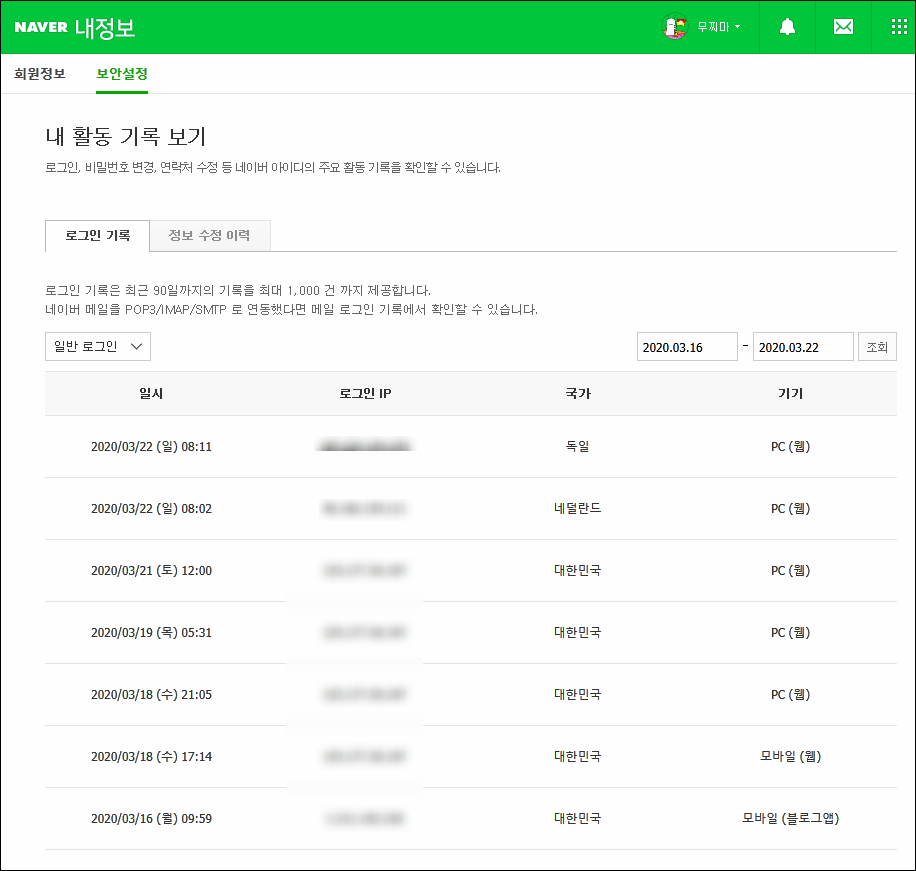 - 네이버 계정의 해외 접속 IP 로그인 차단을 설정한 사용자가