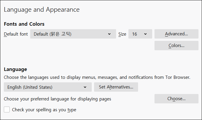 'Language and Appearance'에서 폰트의 종류, 국가 언어 설정을 변경합니다.
