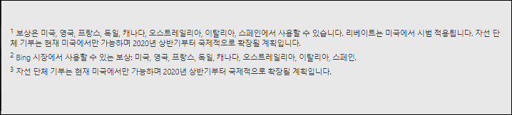 눈길을 끄는 기능이 있습니다. Microsoft의 Bing에서 사용자에게 보상(Microsoft Rewards?)을 해준다고 하는 데, 어떤 형태로 그 서비스를 시행하는지 지켜보아야 할 것 같습니다. 문제는 현재 미국, 영국, 독일, 프랑스, 캐나다, 오스트레일리아, 이탈리아, 스페인에서만 사용할 수 있다는 점입니다. 보상이라는 개념이 광고 뷰 및 클릭과 관련된 것으로 추측합니다. 기존 검색 사이트의 광고 시장을 빼앗아 오기 위한 작업을 시작하는 것이겠죠?