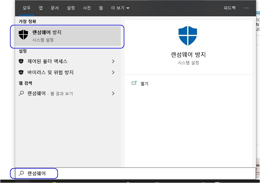 tip 작업 표시줄 옆 검색 창/아이콘에 "랜섬웨어" 입력하면 바로 "제어된 폴더 액세스"를 찾을 수 있습니다.