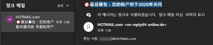중국어로 작성하여 MS Hotmail 사용자 계정으로 발송한 스팸 메일