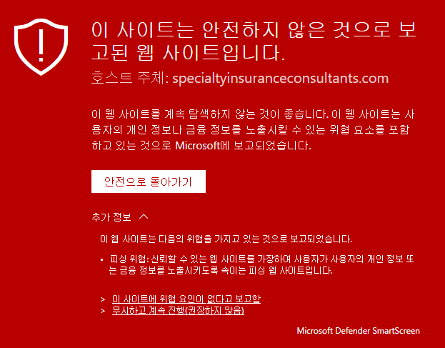 [차단 이유] 해당 웹사이트가 사용자의 개인 정보와 금융 정보를 노출시키는 위협 요소를 포함하고 있는 것으로 Microsoft에 보고된 바 있습니다.