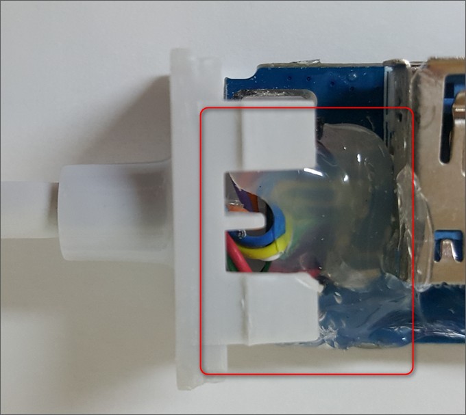 글루건으로 마감 처리하는 것이 별것 아닌 것처럼 보이지만, 이렇게 밀봉을 해놓으면 혹시 PCB에서 분리된 선이 다른 단자와 맞닿거나 케이스로 사용한 알루미늄에 닿아 쇼트가 발생하고 그로 인하여 노트북이나 핸드폰과 같은 고가 제품이 고장날 수 있는 불상사를 막을 수 있습니다.