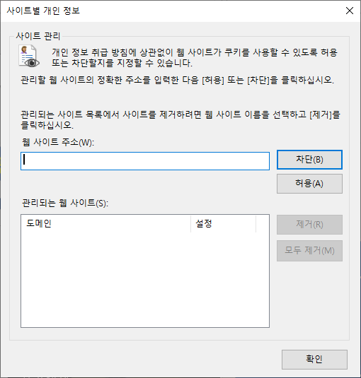사이트(도메인) 별로 쿠키의 허용/차단 설정도 가능합니다.