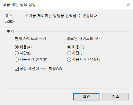 해당 메뉴에서 쿠키 처리하는 방법을 선택합니다.