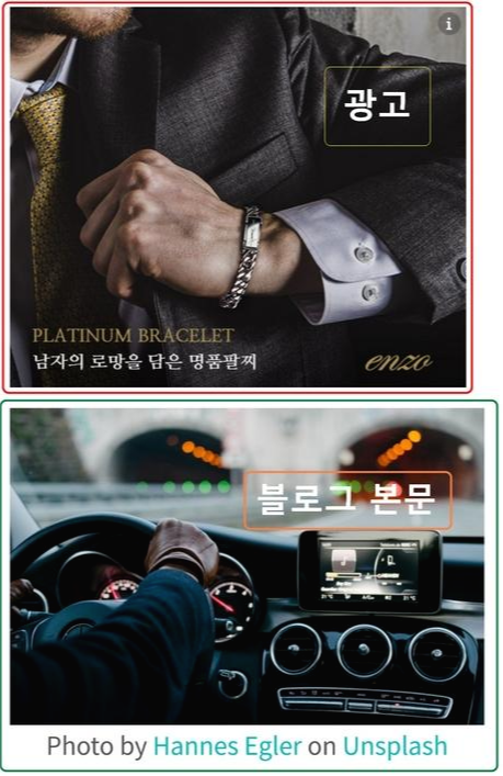 블로그에 등록한 자동차 경고등 관련 페이지의 운전자 스티어링 이미지를 인식하여, 광고 제공 서버에서 정장을 차려입은 모델의 손 모습으로 매칭 한 인라인 맞춤 광고입니다.