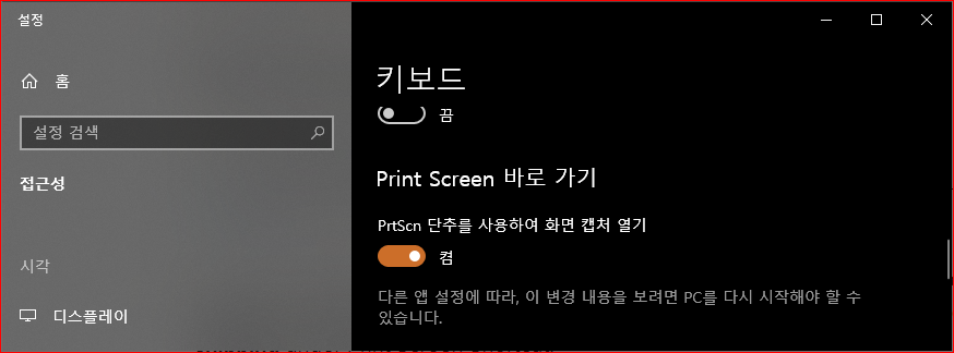 '윈도우 설정 > 키보드' 항목에 들어가면 "Print Screen" 키와 "화면 캡처 열기"를 연동하는 옵션이 있습니다.