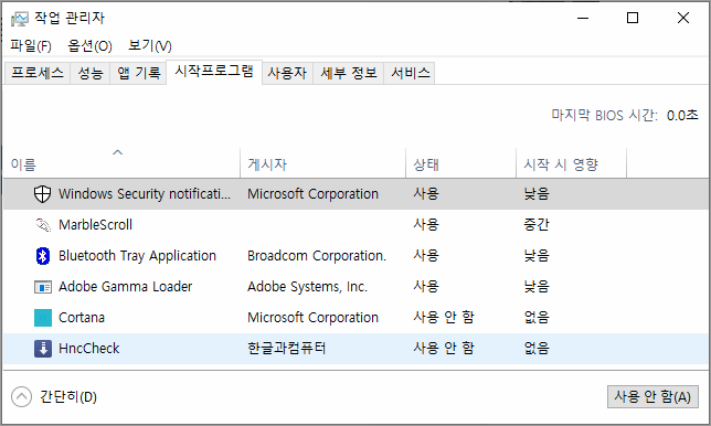 ② '작업 관리자'의 '시작프로그램' 항목에서 설정 변경