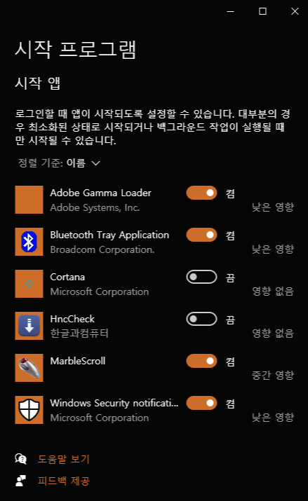 '시작 프로그램' 등록 앱의 On, Off 설정 변경